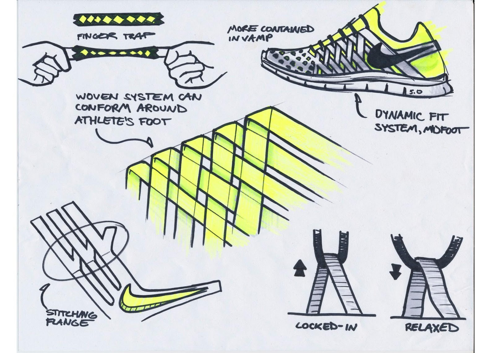 Os designers Laura Parrett e Jeff Rasmussen inspiraram-se num tradicional brinquedo chinês, cuja marca é o entrelaçado de tecidos. Tal como este brinquedo, a parte superior das Free Trainer 5.0 é constituída por faixas interligadas e sobrepostas que são macias e flexíveis.