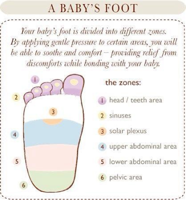 Tal como os adultos também os bebés adoram massagens. Dizem os entendidos que os pés dividem-se por várias zonas que equivalem a diferentes zonas do corpo. No caso do bebé são apresentadas 6 zonas (como se pode ver na imagem).