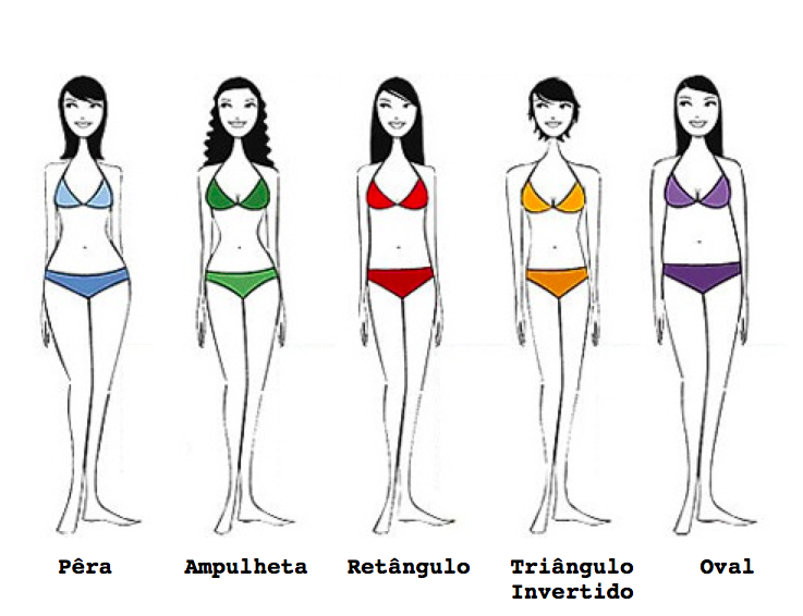 Biquini: Deve dar preferência a partes de cima de alças retas, que “quebram” a largura dos ombros, que ofereçam boa sustentação e que sejam escuros e lisos. Em baixo utilize modelos mais reduzidos ou tangas que podem ter, lateralmente, drapeadados ou aplicações que causam a ilusão de que as ancas são mais largas. Opte por cores claras ou estampadas, principalmente com riscas horizontais.